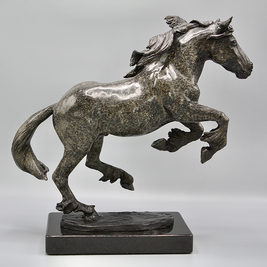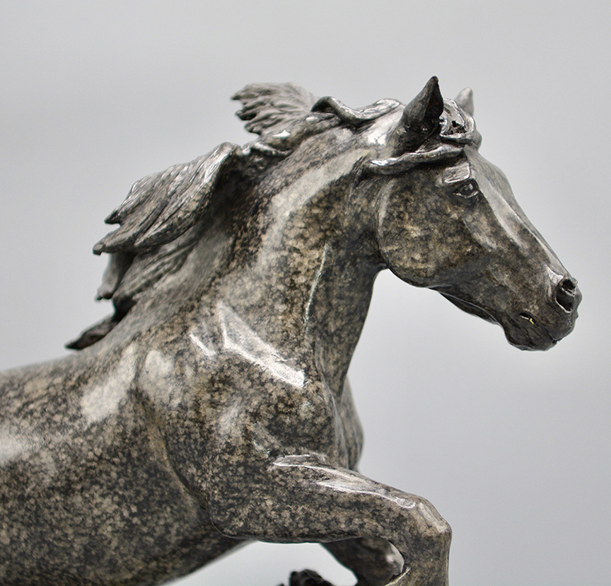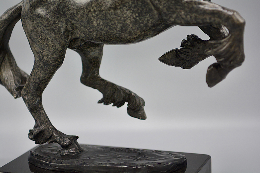 I started with a clay "sketch" to establish critical anatomy landmarks, and then refined the muscles in action to capture the energy and gesture of the forward motion. Just as important, I wanted to convey the intensity and focus of this young stallion as I remembered from hours of observation and by studying many reference photographs.